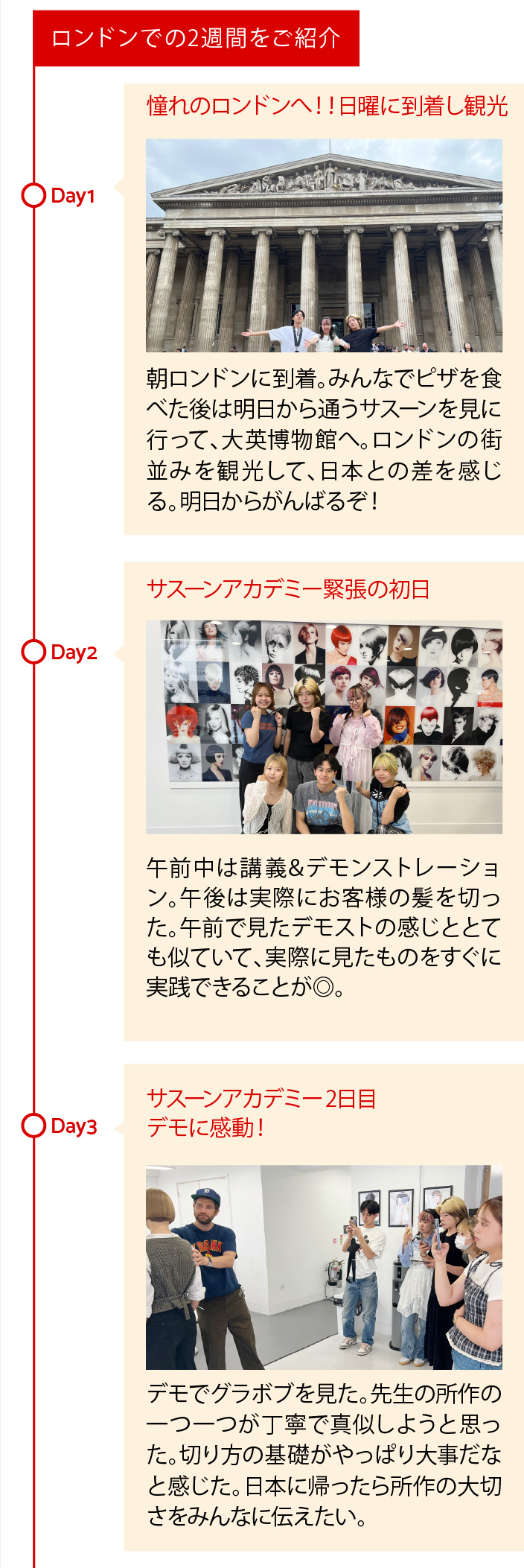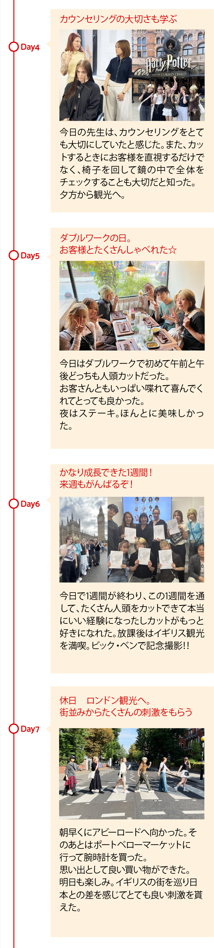 この2週間、何よりうれしかったの何度かチップをいただけたことです。カットしたスタイルをお客様に心から喜んでもらえる瞬間は、美容師を目指そうと思った最初の気持ちを思い出させてくれました。さらにサスーンで学んだのは「ただ技術を習得すること」以上に、その裏にある理論と姿勢です。基礎を大切にし、シンプルに考え丁寧に積み重ねにて行くこと。その一つ一つが自分の中に残り、今後の大きな財産になると感じています。