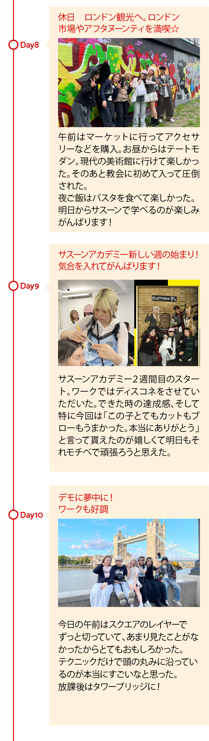 この2週間は技術を高めるだけではなく、自分自身も成長させてくれる体験でした。英語に苦労したことも含めて、すべてが新鮮で学びで溢れていました。これから日本で美容師として働く中でも、サスーン留学で培った技術と姿勢を忘れずに、お客様一人ひとりにより良いスタイル提案ができるように頑張りたいと思います。
