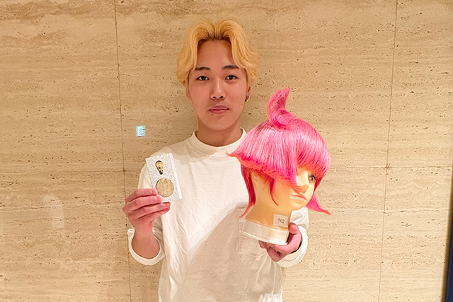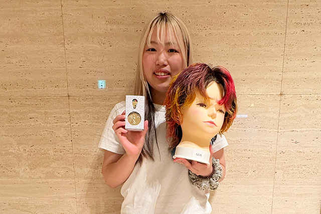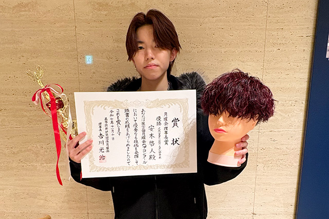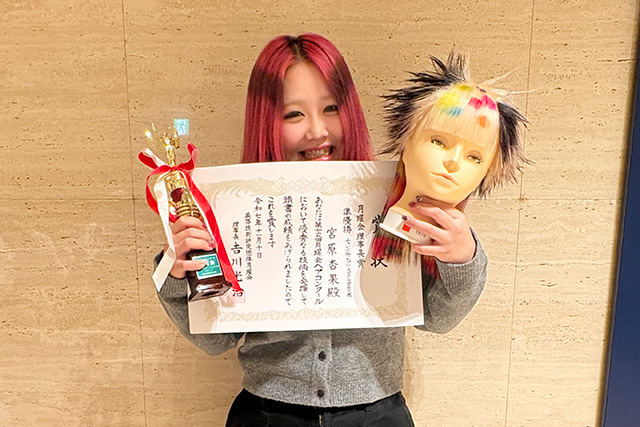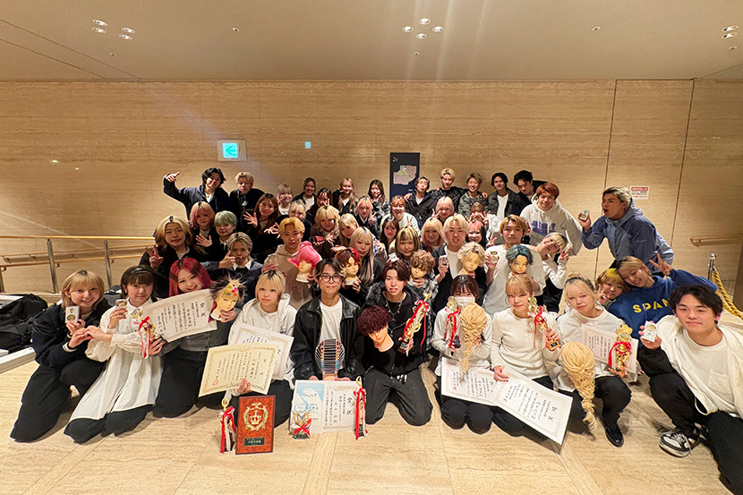 今年はなんと、【ロッド巻き】オールパーパスで優勝・日本ロレアル賞!国家試験課題で準優勝&大阪市長賞受賞!メンズパーマスタイリングでも優勝!そしてまとめ髪の部(サロンスタイル)では準優勝と3位、さらに振袖着付、チャレンジカットでも準優勝を獲得。そのほか多くの種目で入賞を果たし、全部でKANBI生18人が20の賞を受賞しました。